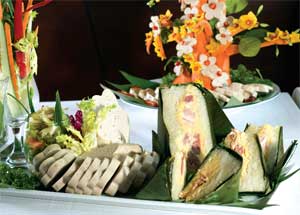 Bánh tét cắt đôi, chả lụa cắt hình hoa mai. Ăn kèm củ kiệu và đồ chua.